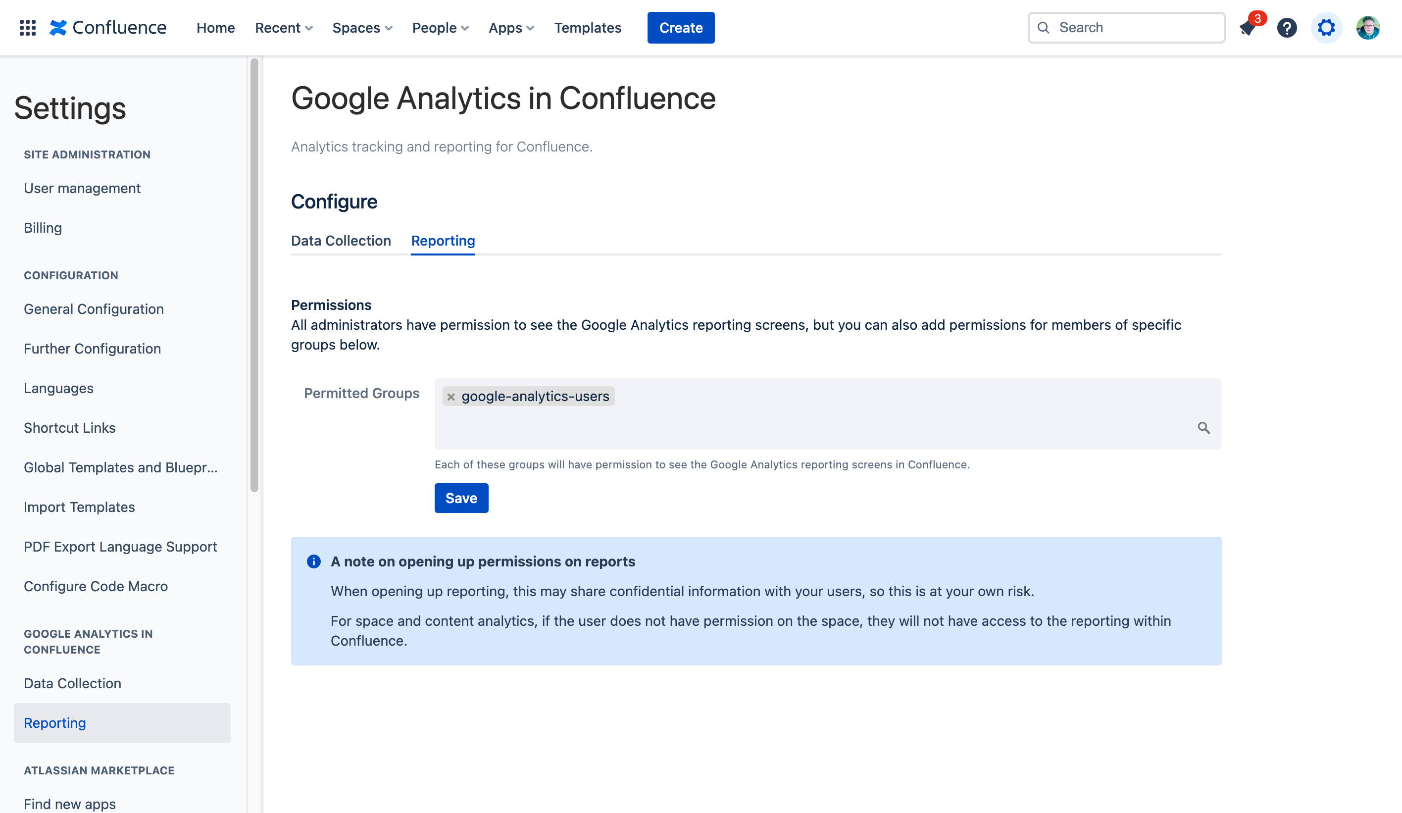 In the Data collection screen, you configure how Google Analytics connects to Confluence