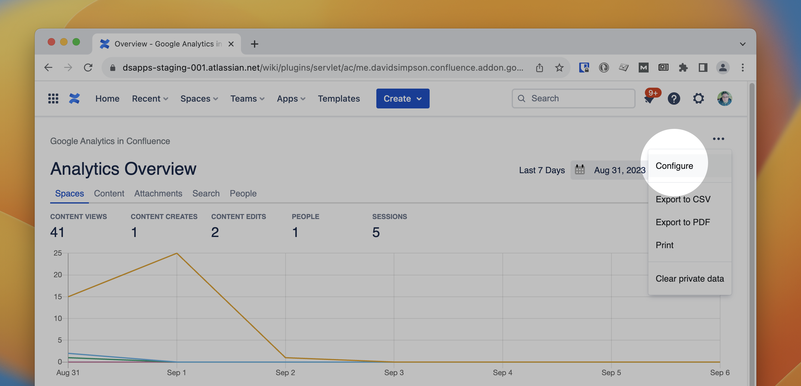 You are a Confluence administrator and the Configure menu item is missing from the Analytics Overview screen: