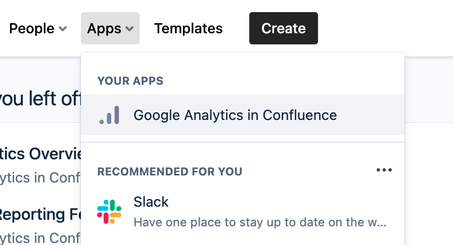 The reporting screens are accessed from the Apps dropdown menu in the Confluence header