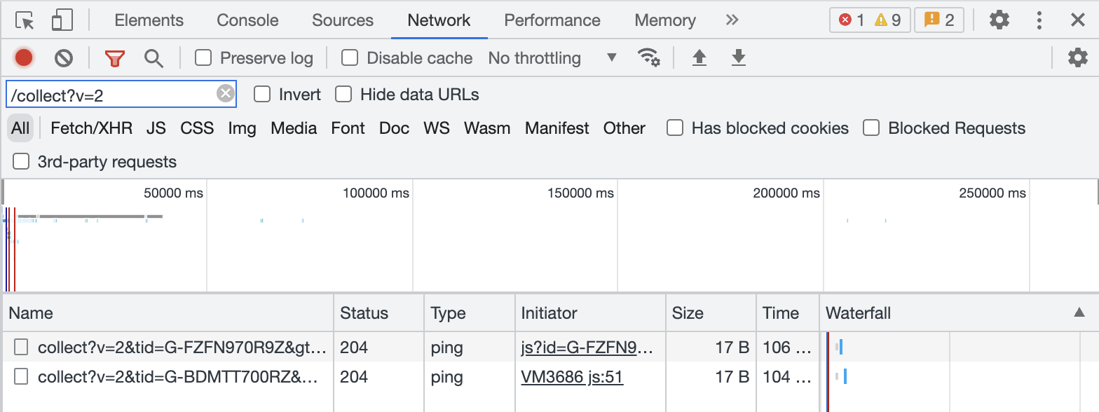 Search for /collect?v=2 in the filter box – there should be 2 data collection calls to the Google Analytics APIs.