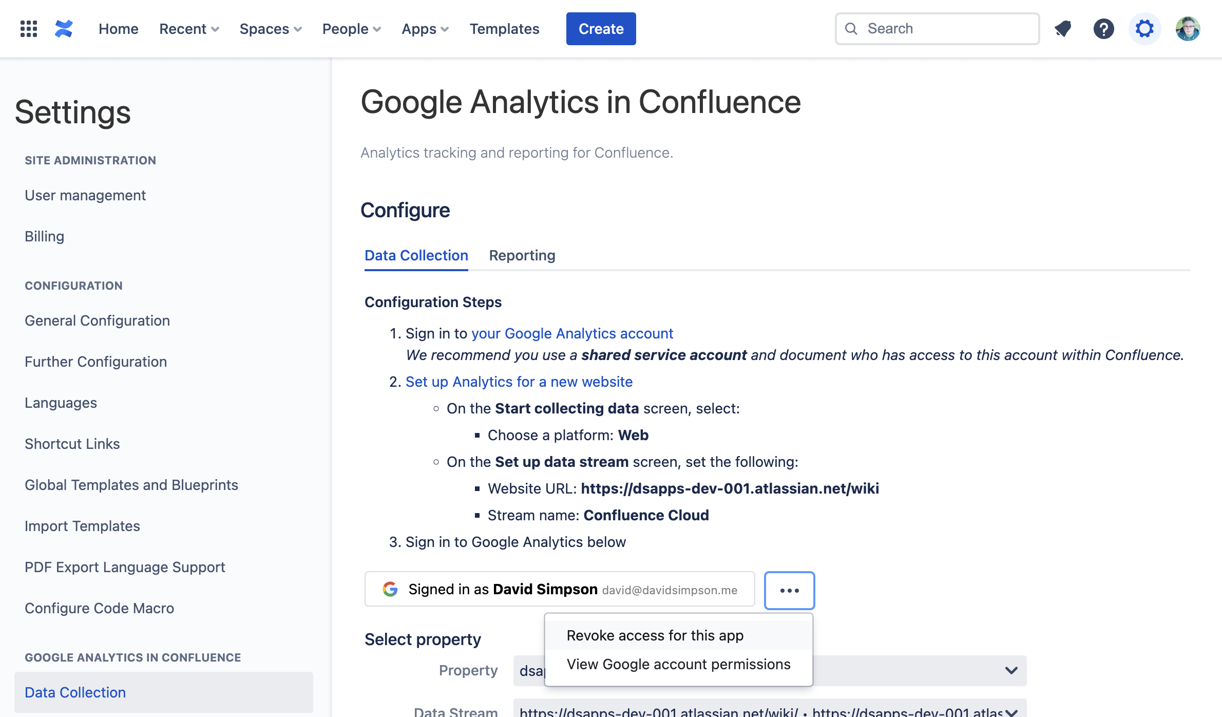 Within Site Administration, select Data Collection from the Google Analytics in Confluence section