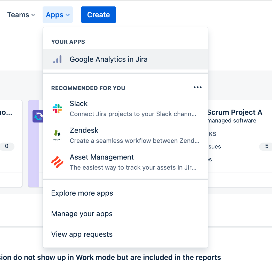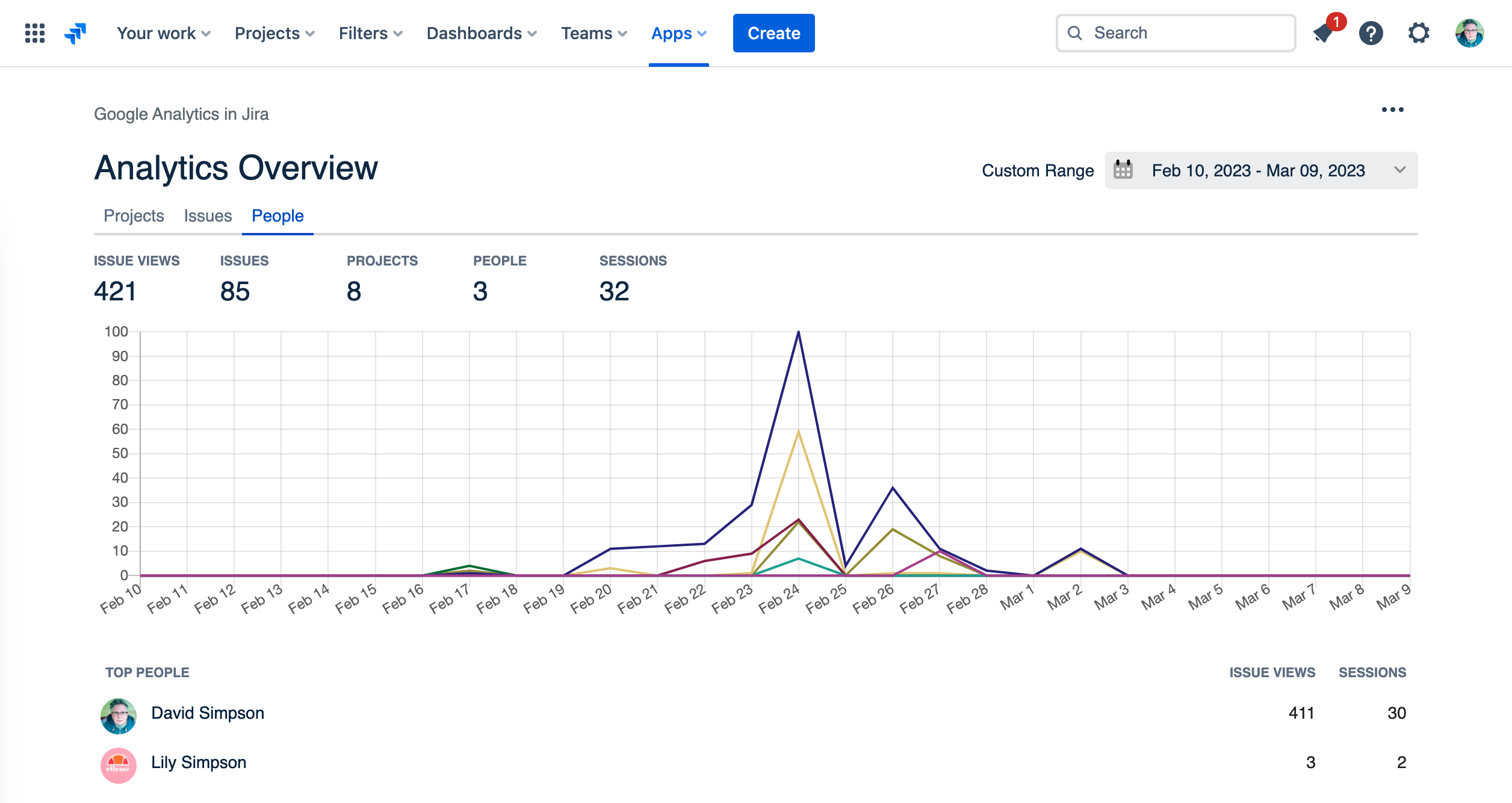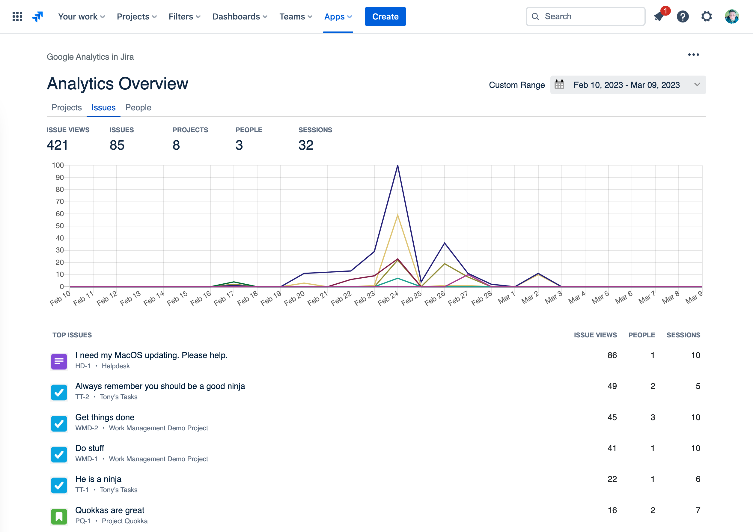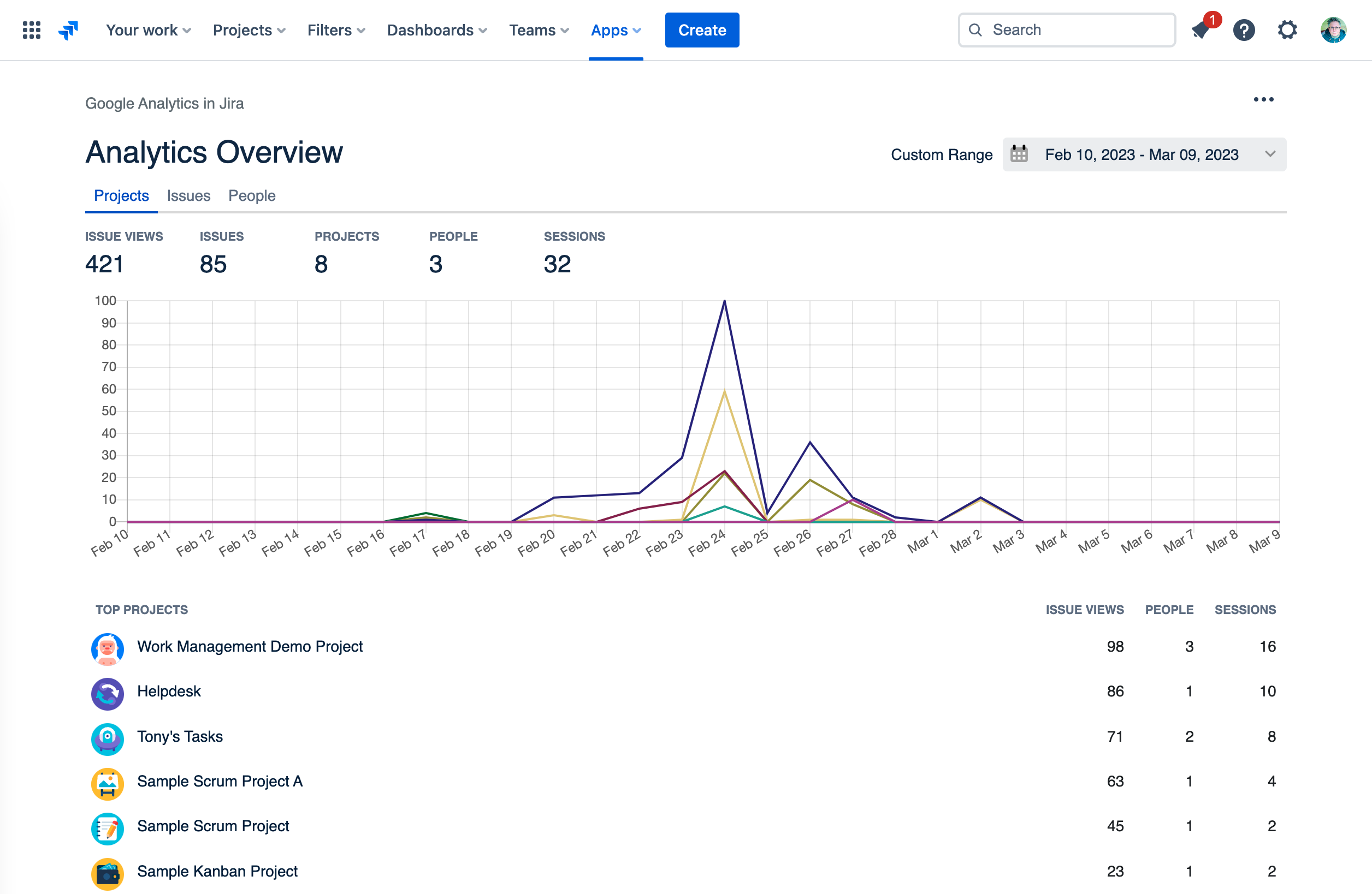 The analytics overview screen is accessed from the Apps dropdown menu in the Jira header