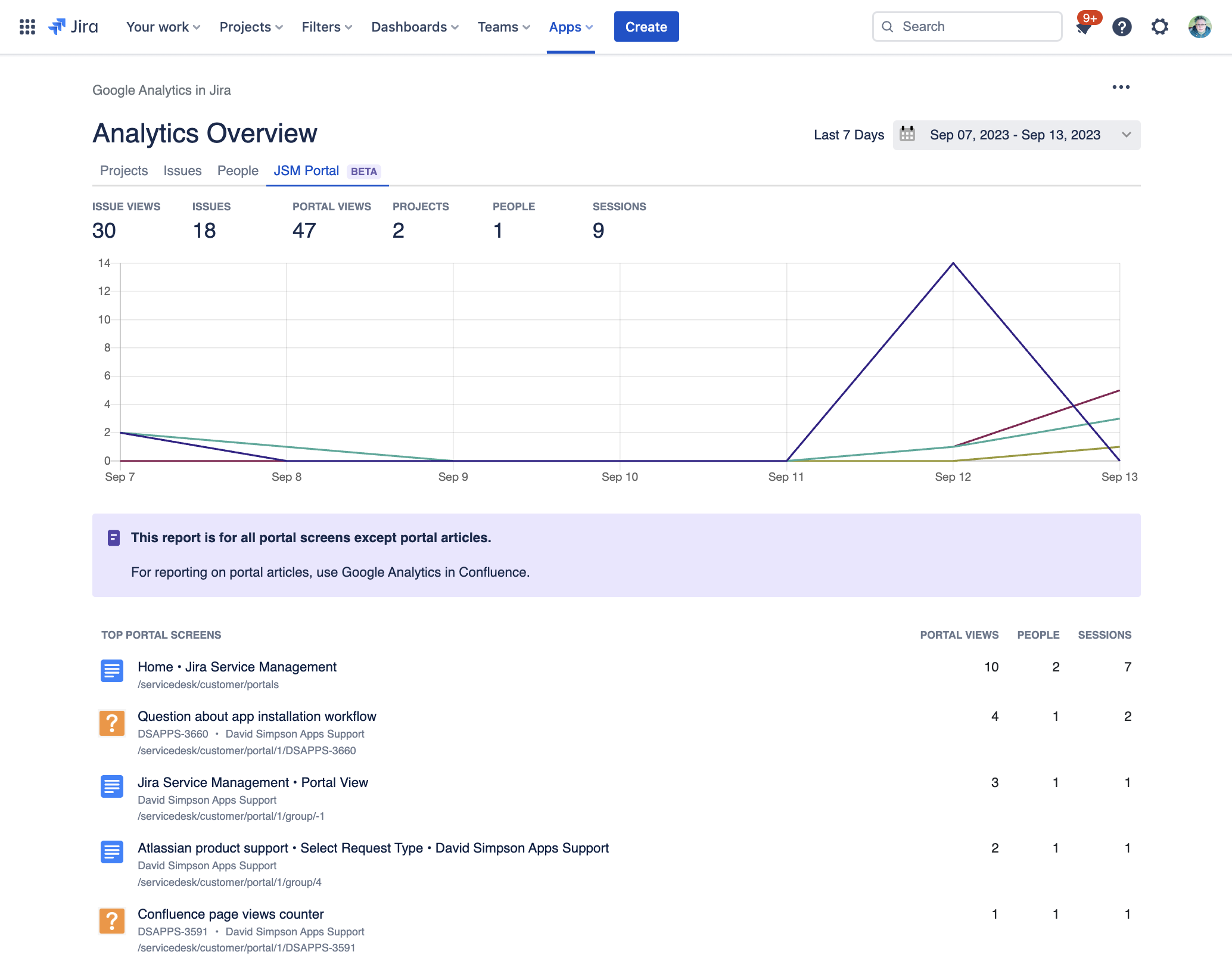 Reporting for all JSM Portal screens except Portal articles – these cannot be track using Google Analytics in Jira, instead use Google Analytics in Confluence