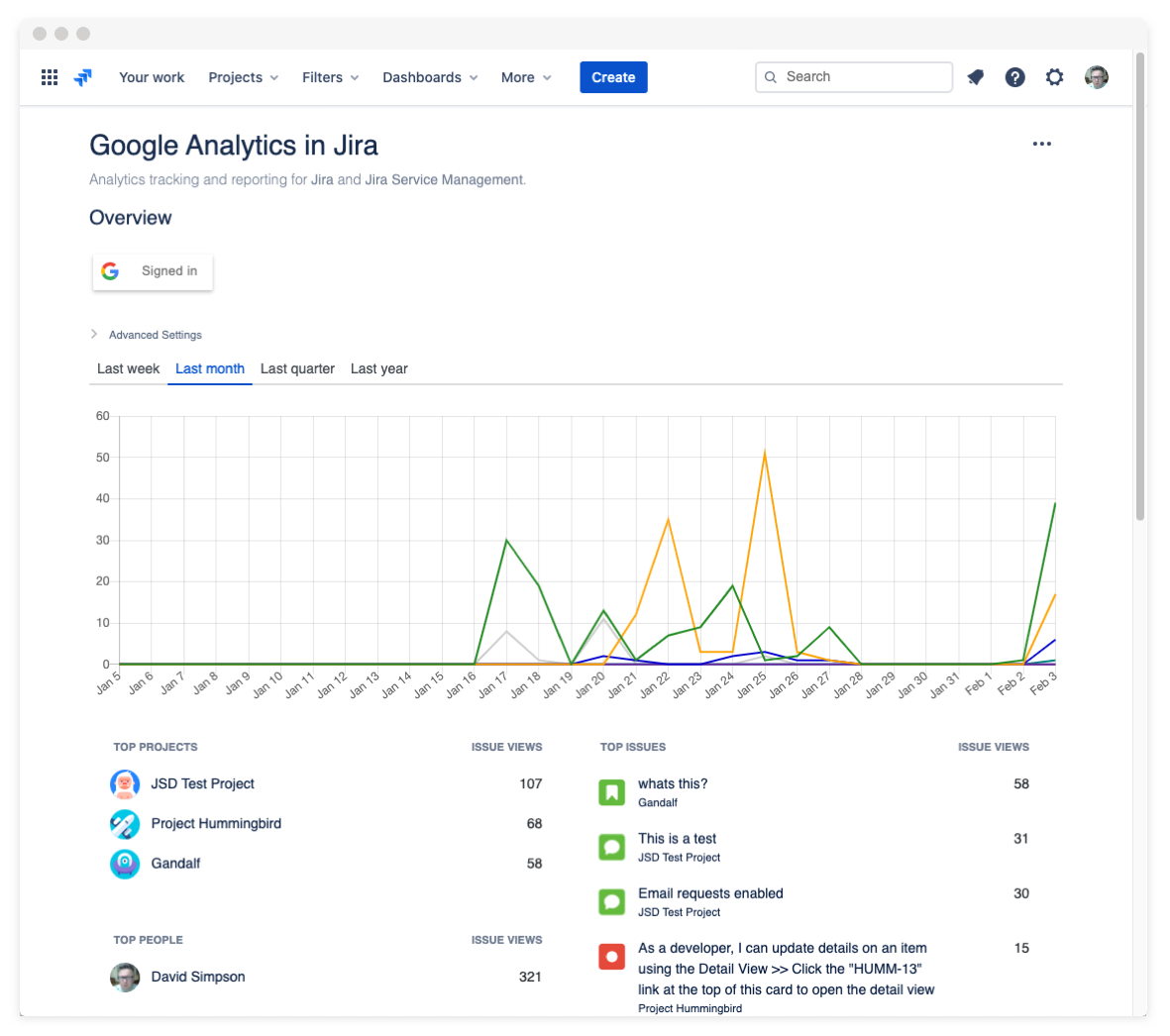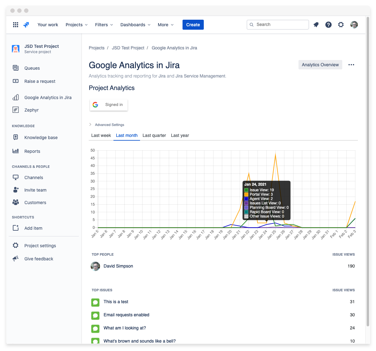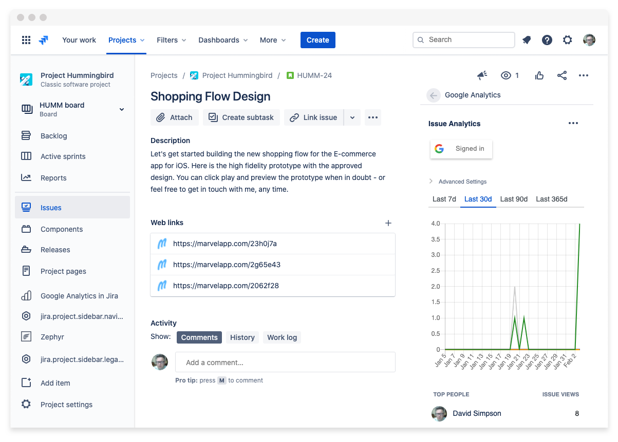 Detailed analytics for individual issues is available from the Google Analytics issue glance on the right hand side of the issue screen