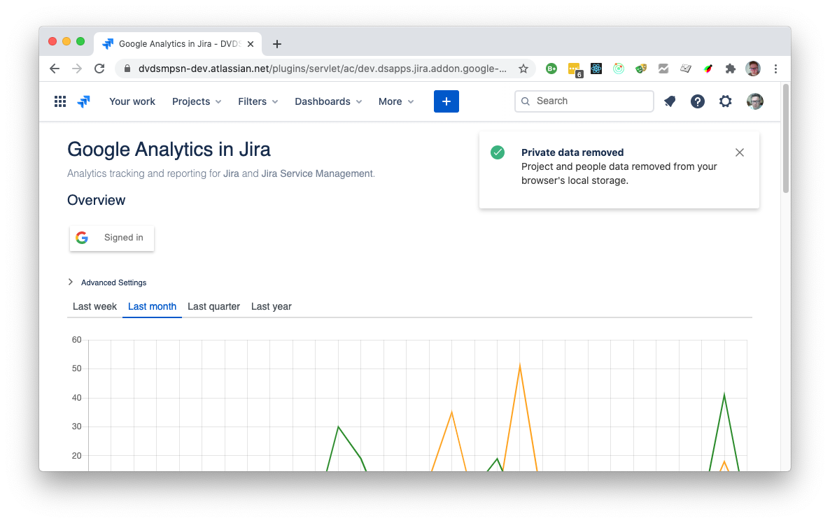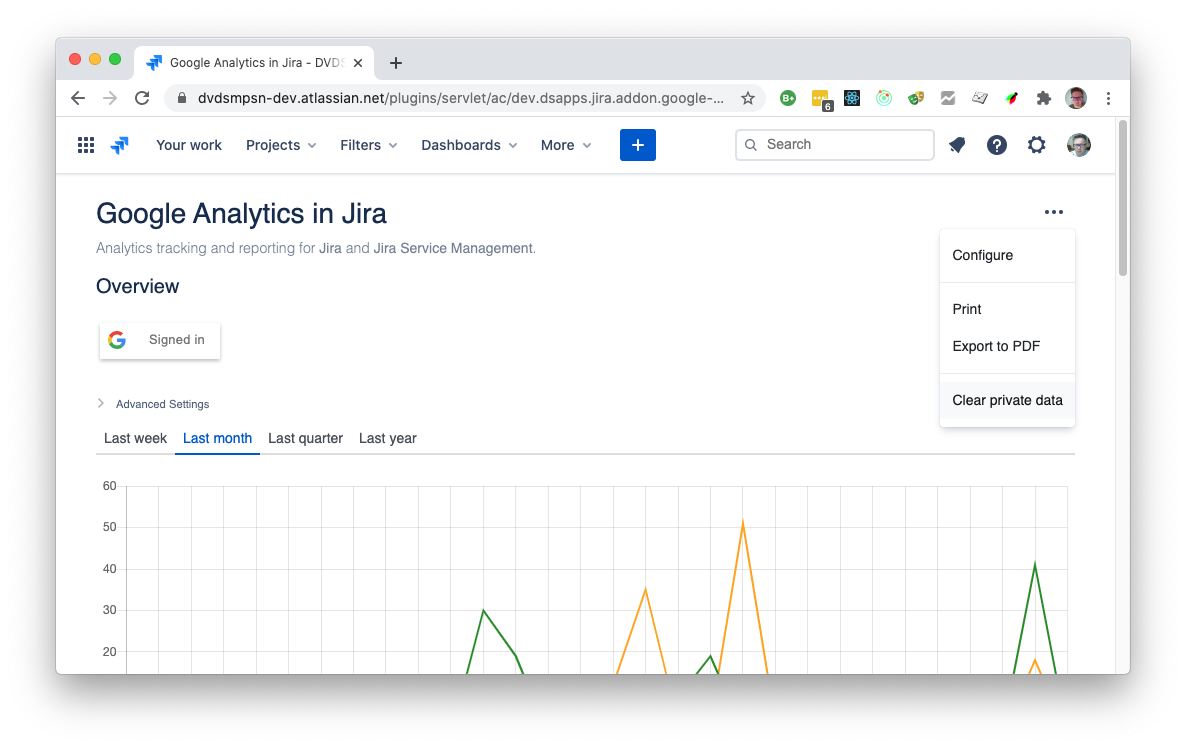 On each Google Analytics in Jira report page, there is a dropdown menu on the top right hand side. Within this menu, there is a button labelled Clear private data: