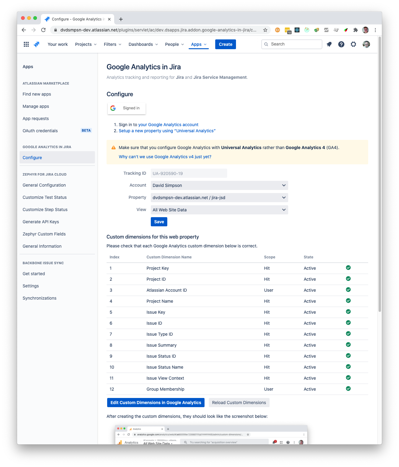 Select the account, property and view that corresponds with your Jira Cloud instance (if you only have one property, this will automatically be filled out), then press the Save button.