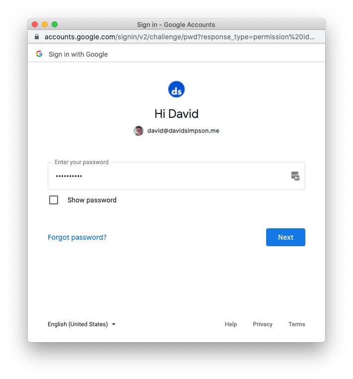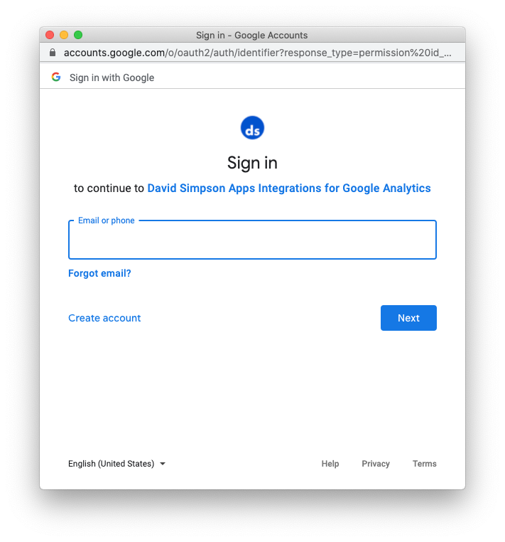 A new “Sign in with Google” window opens – enter your Google Analytics username (email address) and press the Next button