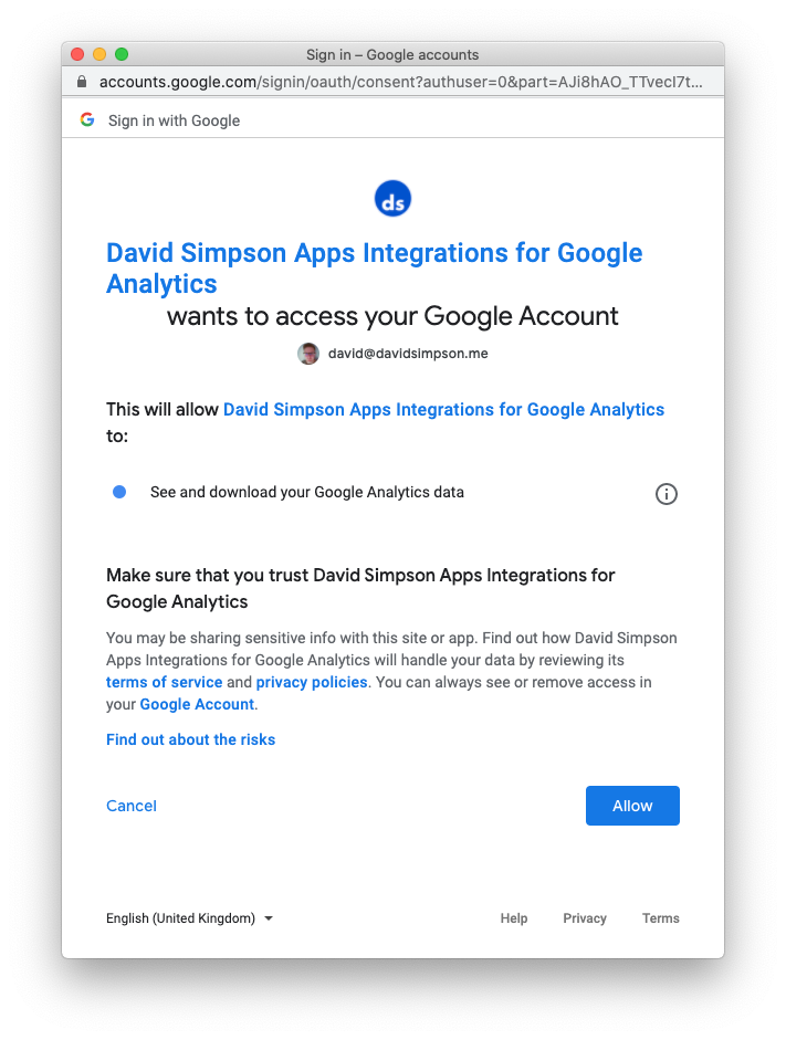A new screen appears displaying that “David Simpson App Integrations for Google Analytics” wants access to view your Google Analytics data. Press the Allow button.