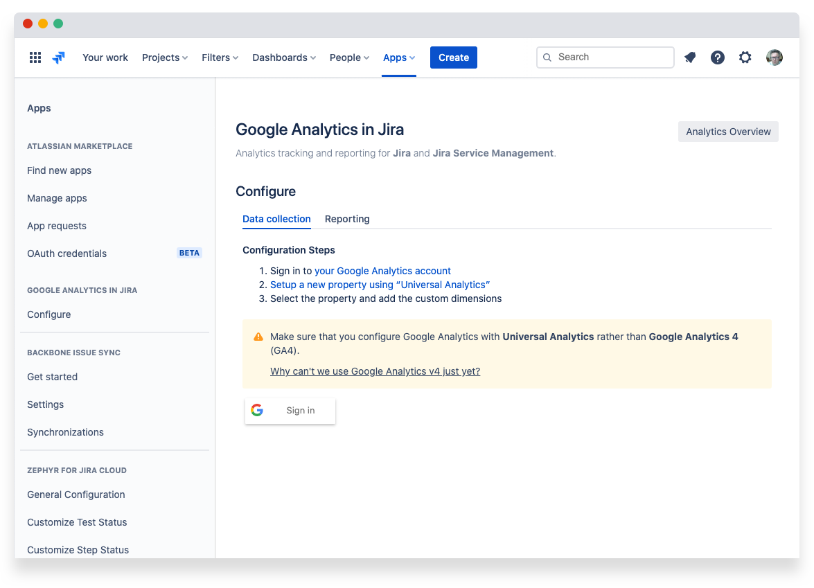 The “Sign in with Google” window closes and your Google Analytics property data is displayed within Jira.