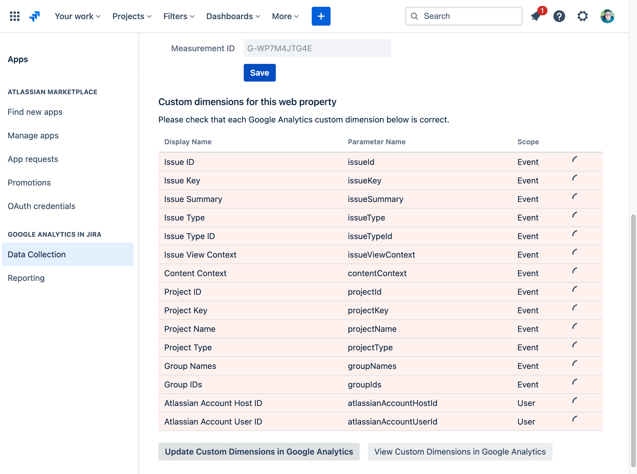 It takes a few seconds to create the custom dimensions, and you’ll see some loading indicators while this happens: