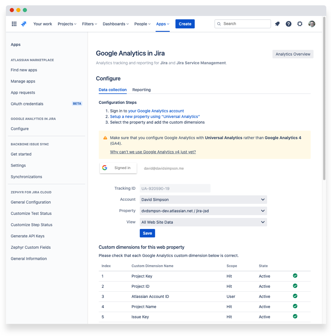 In the Data collection screen, you configure how Google Analytics connects to Jira