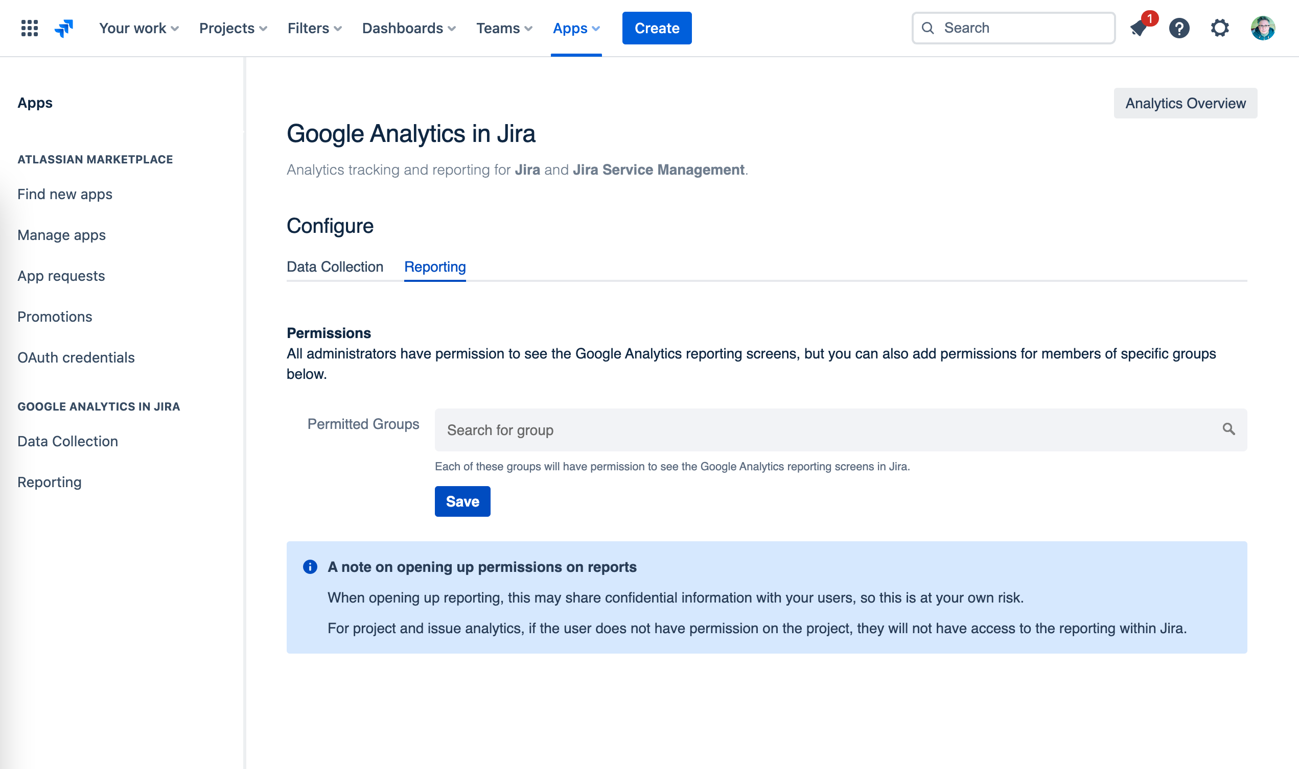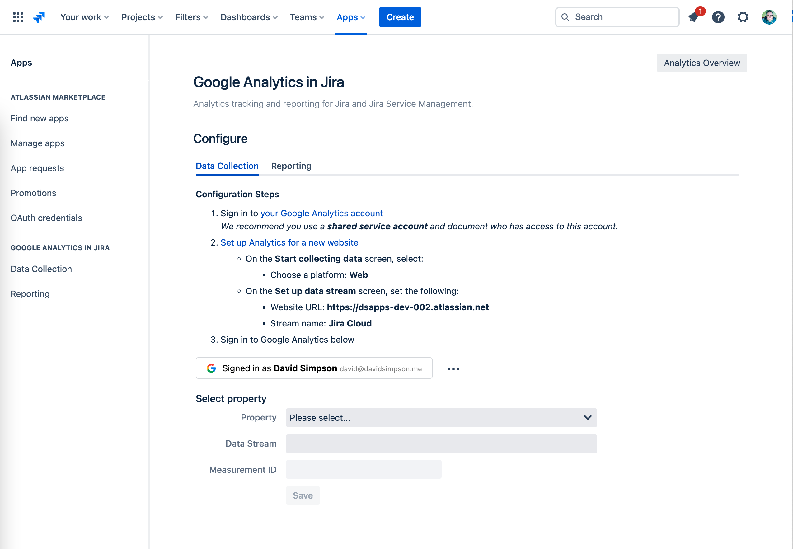 In the Data collection screen, you configure how Google Analytics connects to Jira