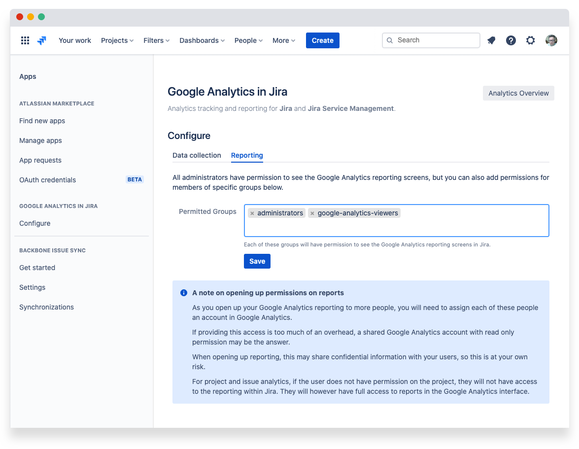 You can now select a Jira group to be added to the permitted groups – members of these groups will have access to Google Analytics reports within Jira.