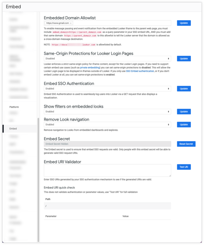 In Looker, the Embed page in the Platform section of the Admin menu lets you configure settings for embedded Looker content.